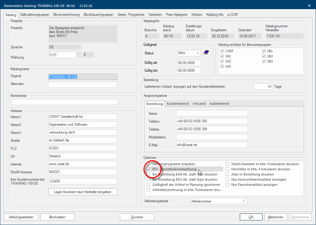 - Om naast een blokverrekening ook het prijsvoordeel van een onderdelenverkoop te kunnen berekenen, moet u eerst de conditieschema´s van de onderdelenverkoop activeren. Open daarvoor de leveranciergegevens van uw leverancier, waarvoor u een onderdelenverkoop wilt invoeren en activeer vervolgens op het tabblad Sommige dialoog venster zijn zo veelomvattend dat de functies in sub-sectoren worden gedeeld. Deze sub-sectoren worden meestal in het bovenste gedeelte van de dialoog getoond en kunnen worden bereikt door te klikken op de betreffende tekst. Catalogus de optie Het woord optie (Latijn: optio = vrije wil) betekend in de informatica een keuzemogelijkheid. In ons geval gaat het daarbij steeds om de ronde keuzevelden. ODV - Onderdelenverkoop toestaan.