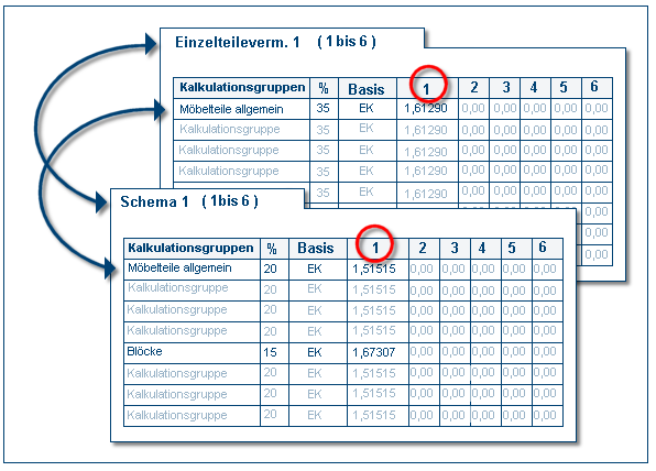 De volgende afbeelding dient ter verduidelijking van de relatie tussen de conditieschema's. Wij nemen aan, u zet voor een planning via de adviseurs sleutel De adviseurs sleutel is een opeenvolging van drie posities waarmee in een planning de nodige factoren en condities kunnen worden toegewezen. Alle artikelgroepen zijn steeds aan één van de drie posities toegekend. Doorgaans zijn dit: 1ste positie Meubelen, 2de positie Toebehoren, 3de positie Apparaten. 111, de opslagfactor 1 in. Zoals reeds beschreven, wordt voor de opslagfactoren 1 tot 6 altijd het conditieschema Schema 1 gebruikt. Zodra u de onderdelenverkoop activeert, wordt parallel het conditieschema onderdelenverkoop 1 gebruikt, omdat ook dit conditieschema voor de opslagfactoren 1 tot 6 verantwoordelijk is.