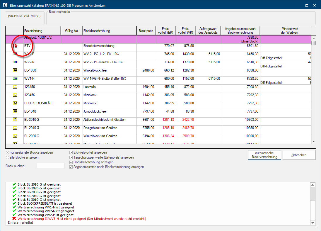 Als u een blokverrekening uitvoert, berekent CARAT eerst het waarde voordeel (zowel IK als VK De VK = Verkoopprijs is in CARAT de prijs die ontstaat door de vermenigvuldiging van de CARAT-lijstprijs met de ingevoerde netto-factor vermeerderd met de BTW.) die de blokverrekening opbrengt. Als de onderdelenverkoop is geactiveerd, berekent CARAT parallel de alternatieve IK alsook VK, gebaseerd op de conditie instellingen van de gebruikte conditieschema's. In de blok keuzedialoog wordt na een geslaagde blokverrekening nu naast de blokken ook de onderdelenverkoop (ODV) getoond. Daarbij wordt de onderdelenverkoop, zoals een blok, gesorteerd op zijn prijsvoordeel. Als de onderdelenverkoop op de eerste plaatst in de blok lijst staat, brengt hij het grootse inkoop voordeel op en kan in de offerte overgenomen worden zoals een blok.