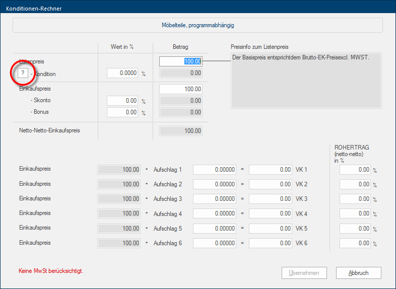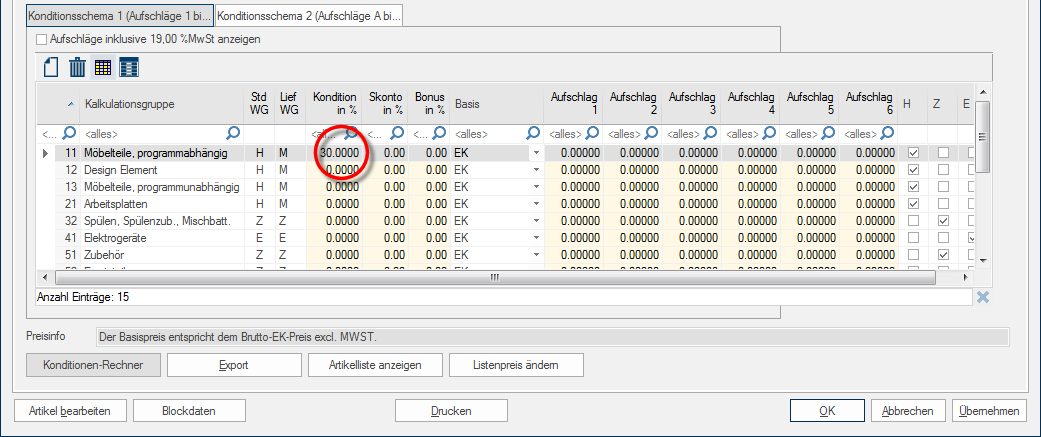 - U kunt de conditie nu voor de uitgekozen artikelgroep Via een artikelgroep worden in één groep een willekeurig aantal van artikelen samengevat, die een artikel typische gemeenschappelijkheid hebben. Zo worden meestal alle artikelen zoals bijv. meubelen maar ook werkbladen, spoelbakken of elektrische apparaten in dienovereenkomstige artikelgroepen samengevat. overnemen en gelijkertijd de conditiecalculator sluiten door te klikken op de knop Toepassen.