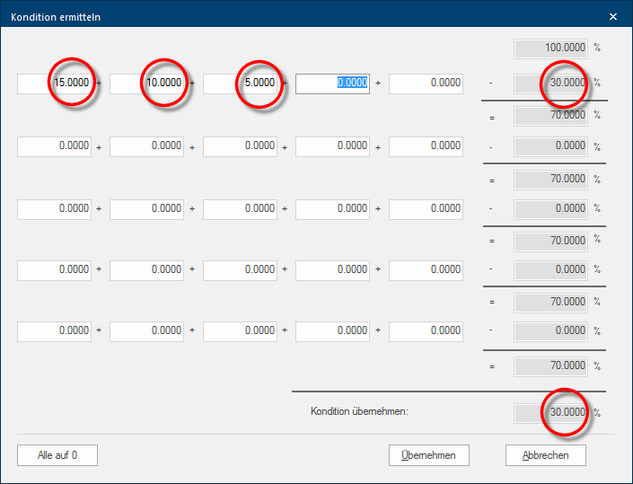 Het kan gebeuren dat meerdere individuele condities ter beschikking staan, die u tot één totale conditie moet cumuleren om die in CARAT te kunnen invoeren.