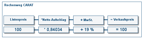 De volgende grafiek dient ter verduidelijking van de rekenweg in CARAT. Onafhankelijk van het feit of u een opslagfactor inclusief BTW heeft ingevoerd, vermenigvuldigt CARAT eerst de lijstprijs met de netto opslagfactor en telt vervolgens de aan het betreffende artikel toegewezen BTW erbij op. Deze werkwijze is nodig, zodat ook verschillende BTW percentage's kunnen worden gebruikt.