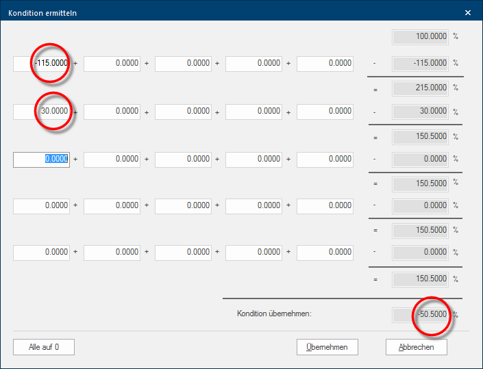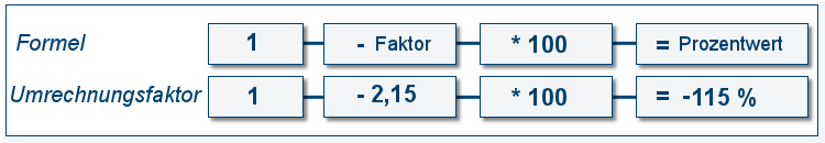Uitgangswaarde 100%- -115% (twee maal minus geeft plus) is gelijk aan 215%. Vervolgens wordt van die 215% de 30% conditie afgetrokken. Dit geeft zodoende een totale waarde van 150,50%. Deze waarde worden afgetrokken van de uitgangswaarde (100%), waardoor dit een totale conditie van -50,50% opbrengt. Door het negatieve voorteken kunt u herkennen dat het hier gaat om een opslagfactor.