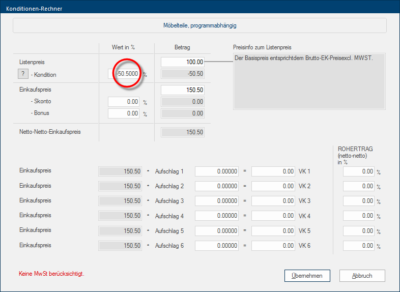 - De totale conditie wordt overgenomen zodra u op de knop Toepassen klikt, en nu kan in de conditiecalculator reeds de IK uitgaande van de ingevoerde lijstprijs worden berekend.
