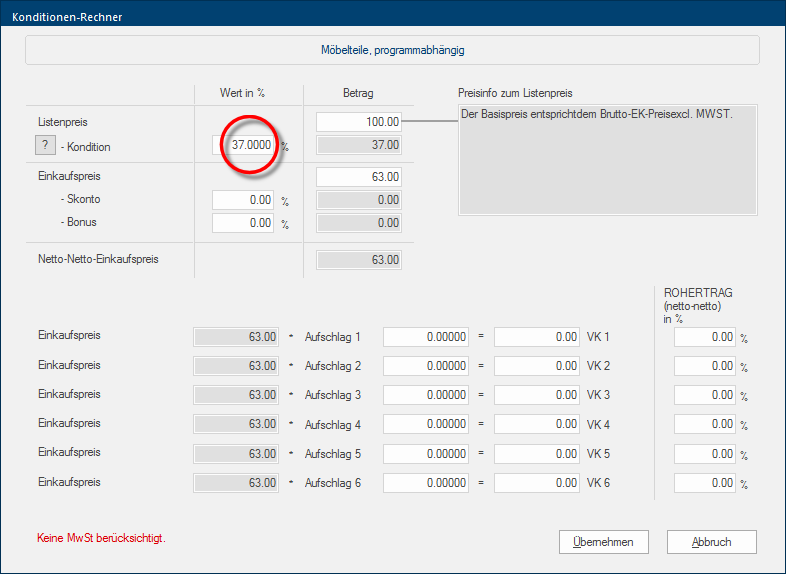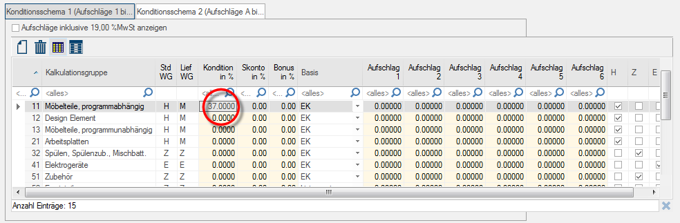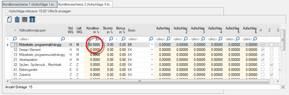 - U kunt de conditie nu voor de uitgekozen artikelgroep Via een artikelgroep worden in één groep een willekeurig aantal van artikelen samengevat, die een artikel typische gemeenschappelijkheid hebben. Zo worden meestal alle artikelen zoals bijv. meubelen maar ook werkbladen, spoelbakken of elektrische apparaten in dienovereenkomstige artikelgroepen samengevat. overnemen en gelijkertijd de conditiecalculator sluiten door te klikken op de knop Toepassen.