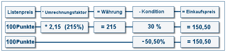 In het bijzonder in de export kan het gebeuren, dat in de catalogigegevens als basisprijs (lijstprijs) verrekening punten ingevoerd werden, om voor de verschillende landen middels een wisselkoers verschillende calculatiebasissen te kunnen bereiken. Afhankelijk van de leverancier, kan het ook voorkomen dat de catalogusvaluta afwijkt van de gebruikte nationale valuta en er daarom extra een vaste valutafactor voor het omrekenen wordt bepaald.