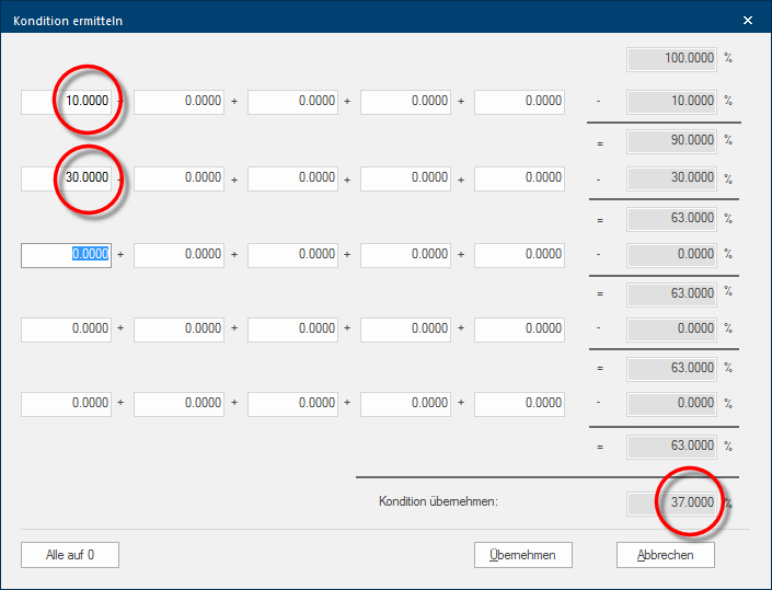Zoals u kunt herkennen van de volgende grafiek, resulteert een berekende totale conditie van 37% in hetzelfde als wanneer u eerst de lijstprijs met de valutafactor van 0,9 (10%) in een valuta omrekent en vervolgens uw conditie (30%) daarvan aftrekt.