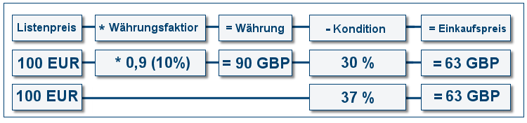 - U heeft van CARAT catalogigegevens in EUR (EURO) ontvangen, uw systeemvaluta moet echter GBP (Great Britain Pound) zijn. Uw leverancier geeft u voor de omrekening een valutafactor van 0,9 voor. Bovendien krijgt u een conditie van 30%. Met behulp van de formule kunt u de valutafactor omrekenen in een percentagewaarde.
