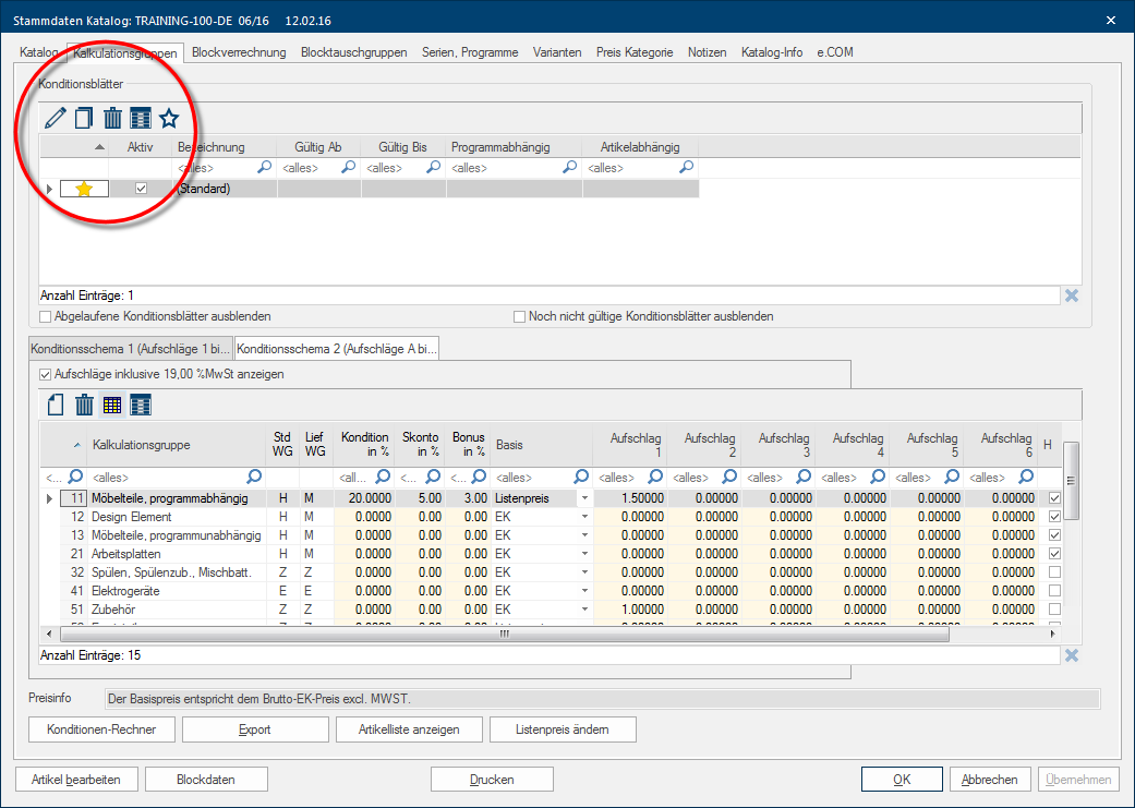 De conditiebladen Op een conditieblad worden de calculatie-gegevens voor alle artikelgroepen en conditieschema's ingevoerd. Voor de basis calculatie dient steeds het conditieblad "standaard". U kunt echter ook meerdere conditiebladen aanleggen, om daarmee speciale eisen te kunnen omzetten. worden u getoond in het bovenste gedeelte van het tabblad Sommige dialoog venster zijn zo veelomvattend dat de functies in sub-sectoren worden gedeeld. Deze sub-sectoren worden meestal in het bovenste gedeelte van de dialoog getoond en kunnen worden bereikt door te klikken op de betreffende tekst. Artikelgroepen Via een artikelgroep worden in één groep een willekeurig aantal van artikelen samengevat, die een artikel typische gemeenschappelijkheid hebben. Zo worden meestal alle artikelen zoals bijv. meubelen maar ook werkbladen, spoelbakken of elektrische apparaten in dienovereenkomstige artikelgroepen samengevat.. Voor ieder catalogusversie moet tenminste één conditieblad als standaard vastgelegd worden. Het standaard conditieblad kunt u herkennen aan het ster symbool. Er kan altijd slechts één conditieblad als standaard worden vastgelegd. Als een catalogus voor de eerste keer in CARAT wordt ingelezen dan wordt automatisch ook het conditieblad Standaard aangelegd. Met extra conditiebladen kunt u verdere calculatiegegevens beheren en sturen, die u bijvoorbeeld voor tijdelijk beperkte acties, voor speciale actieprogramma´s of in verbinding met het filiaalbeheer, voor individuele filialen nodig heeft. CARAT gebruikt voor de prijsberekening altijd alleen maar geactiveerde conditiebladen. Onder de conditiebladen bevindt zich het conditieschema, waarin de calculatiegegevens van het gemarkeerde conditieblad getoond en bewerkt worden.