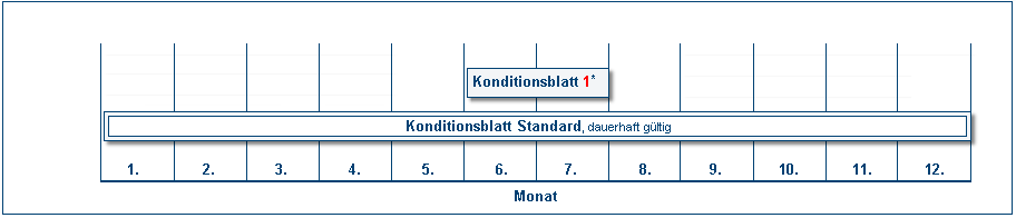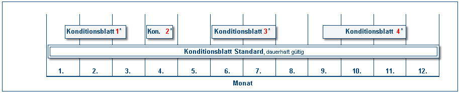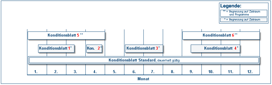 De volgende afbeelding dient ter verduidelijking van het voorbeeld. Van de voorgaande voorbeelden bestaan reeds vier tijdsbeperkte conditiebladen (1-4) en twee conditiebladen (5+6) met beperkingen van de programma's. Door de aanvullende beperking op individuele uitvoeringen en varianten mag de geldigheidsperiode van dit conditieblad (7) zich overlappen met de andere conditiebladen.