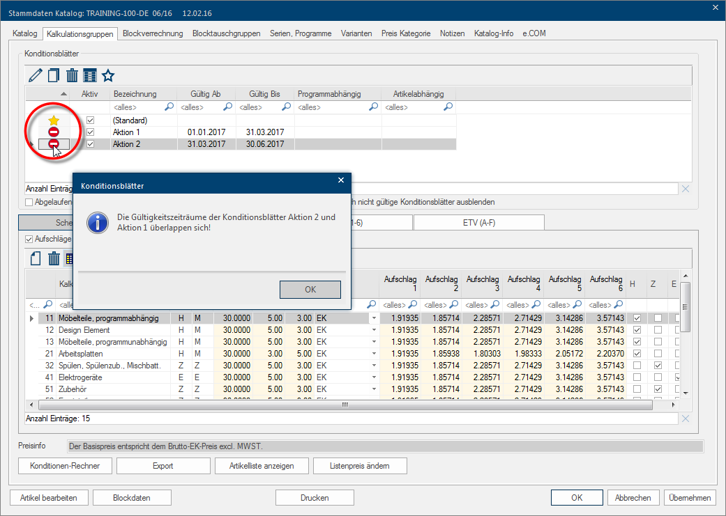 Omdat tijdbeperkte conditiebladen geen verdere beperking hebben, mogen deze conditiebladen qua geldigheidsperiode niet overlappen. Zodra u een tijdsbeperkt conditieblad activeert wordt daarom door CARAT automatisch de geldigheidsperiode gecontroleerd, en bij ontoelaatbare overlappingen worden de betroffen actieve conditiebladen gemarkeerd met een foutstatus. Als u met de linker muisknop een foutstatus aanklikt, wordt getoond waarom dit conditieblad door CARAT als foutief herkend wordt.