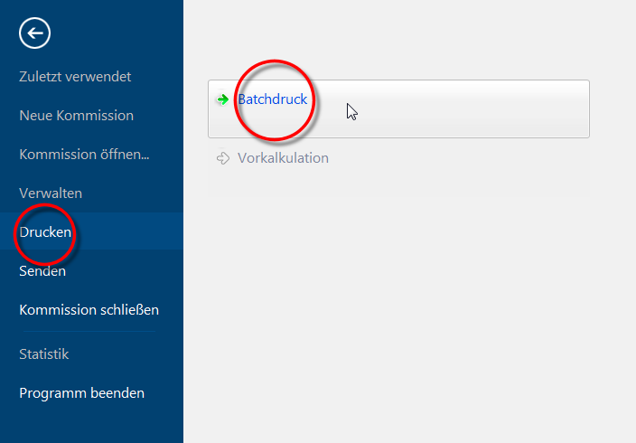 De functies Batchafdruk en Batchmail staan u bij een geopende commissie op ieder moment ter beschikking via het gedeelte Bestand. U kunt het gedeelte Bestand openen via de menubalk. Zie ook: Het tabblad - Bestand