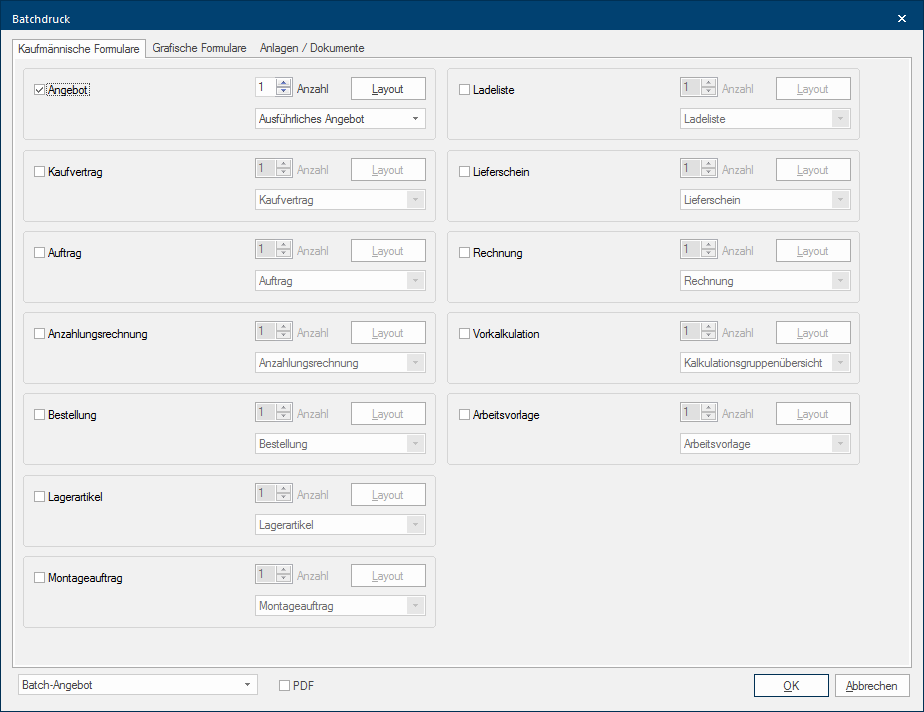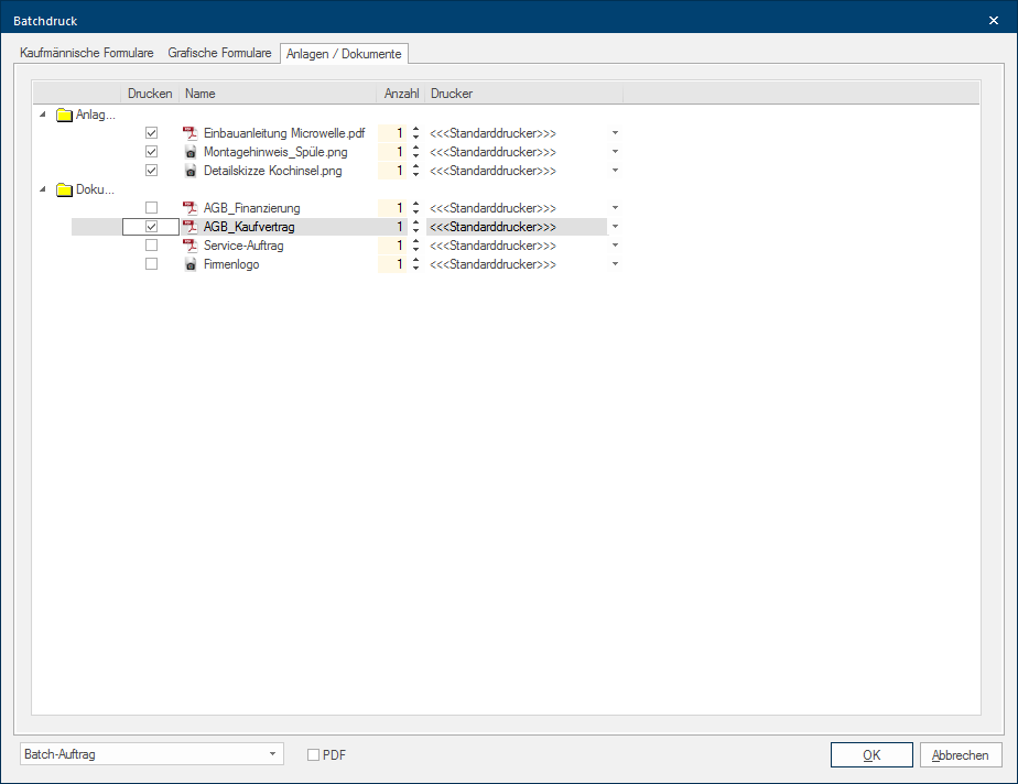 - Zodra u de functie heeft uitgekozen opent zich de betreffende Batchafdruk of Batchmail dialoog Speciale vensters in software-toepassingen worden dialoog, dialoog venster of dialoog veld genoemd. Dialoog vensters worden in verschillende situaties van de toepassing getoond om bepaalde invoer of bevestigingen van de gebruiker te verkrijgen.. De dialoog is verdeeld in drie tabbladen Sommige dialoog venster zijn zo veelomvattend dat de functies in sub-sectoren worden gedeeld. Deze sub-sectoren worden meestal in het bovenste gedeelte van de dialoog getoond en kunnen worden bereikt door te klikken op de betreffende tekst.. Via deze dialoog kunt u bepalen welke documenten u in één werkprocesstap wilt uitprinten of samengevat als één PDF-document wilt aanmaken.
