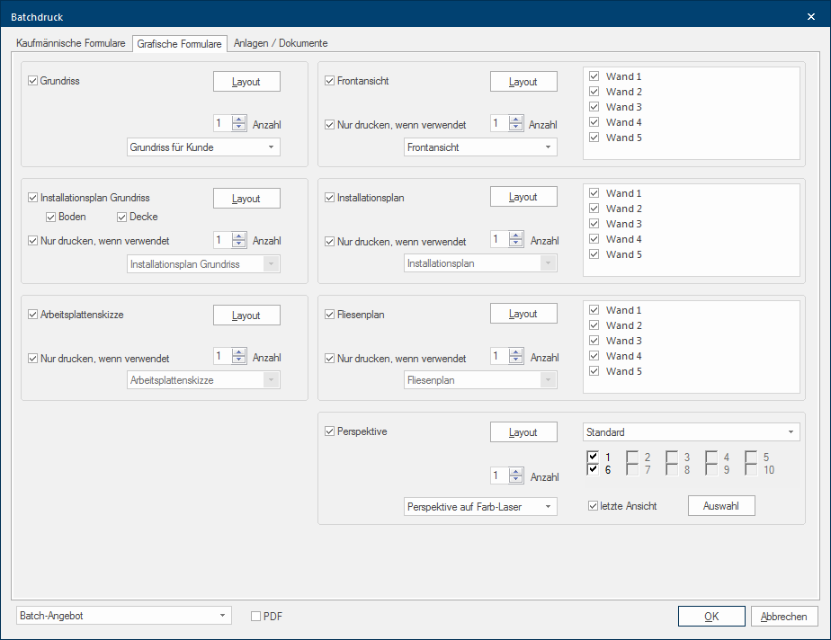 Via een batchafdruk profiel voor een offerte kunt u bijvoorbeeld vastleggen dat altijd de commerciële offerte, de plattegrond alsook een perspectief aanwezig moeten zijn. Een ander profiel voor een opdracht zou dan ook nog het installatieschema en het tegelplan kunnen bevatten. Zeker als u verschillende documenten direct na elkaar wil print of een PDF-document met meerdere pagina's voor het versturen per e-mail wil maken, zou het veel teveel werk zijn de nodige documenten iedere keer opnieuw te moeten selecteren om te printen. Met een batchafdruk profiel is dit natuurlijk veel eenvoudiger en sneller op te lossen. Zie ook: Print-lay-out