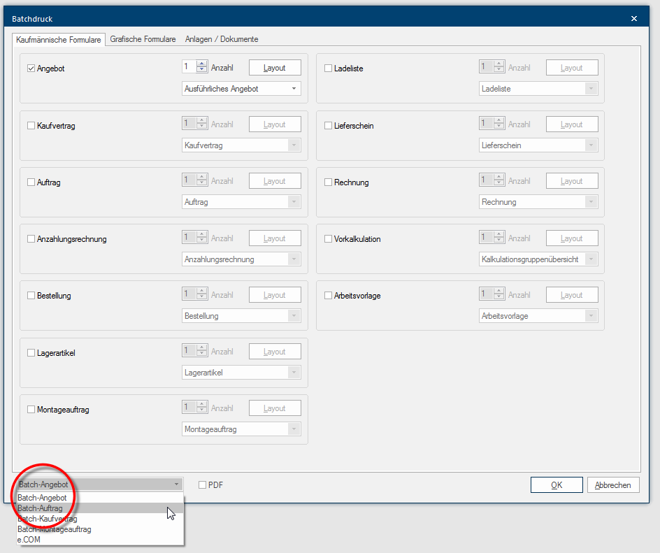 Met de functie batchafdruk kunt u meerdere commerciële en grafische formulieren selecteren en ze direct in één keer printen of op een eenvoudige manier een PDF Het Adobe Portable Document Format (PDF) werd in de 80-er jaren door Adobe Systems ontwikkeld en geperfectioneerd. Adobe PDF-bestanden bevatten gegevens uit verschillende toepassingen, die op iedere computer kunnen worden getoond, en ze zijn dus geschikt voor de uitwisseling met gebruikers in de hele wereld.-document met meerdere pagina's eruit maken. Via de extra Batchmail functie heeft u bovendien de mogelijkheid om direct vanuit CARAT een e-mail E-Mail (van Engels electronic mail, elektronische post/brief; kortweg ook Mail) staat voor een op een brief lijkende boodschap die op elektronische weg in computer netwerken wordt overgedragen. te creëren.