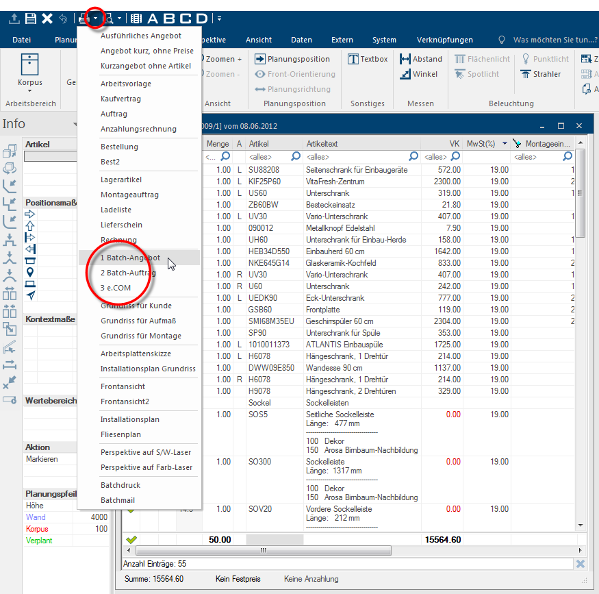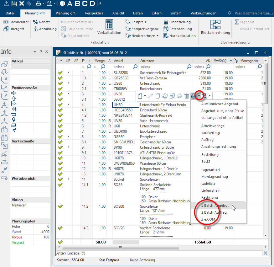 Via het contextmenu In bijna alle Windows-programma´s wordt door het klikken met de rechter muisknop een keuze menu geopend, waarin de commando's staan die zinvol zijn voor de volgende werkprocessen. van de stuklijst of via de snelle toegang kunt u indien gewenst een batchafdruk profiel ook direct oproepen.