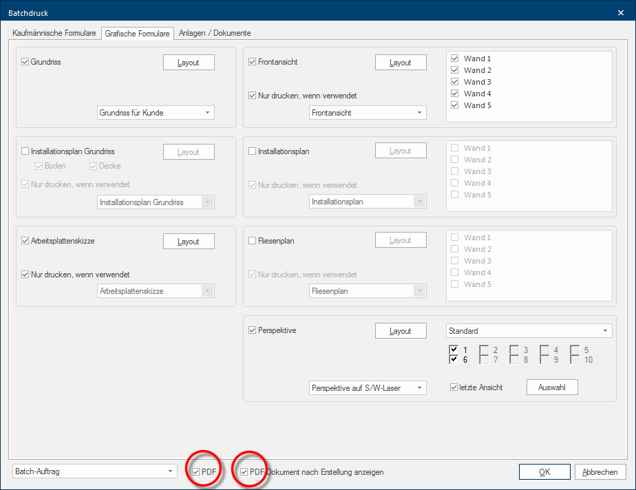 Met de optie Het woord optie (Latijn: optio = vrije wil) betekend in de informatica een keuzemogelijkheid. In ons geval gaat het daarbij steeds om de ronde keuzevelden. PDF, aan de onderste rand van de dialoog Batchafdruk, kunt u van de uitgekozen formulieren een PDF maken. Indien u ook de optie PDF-document na aanmaken tonen activeert, wordt de PDF na het opslaan, ter controle getoond. Voorwaarde daarvoor is natuurlijk, dat u op uw computer een programma voor het tonen van PDF's geïnstalleerd heeft. Zie ook: Adobe Acrobat Reader DC