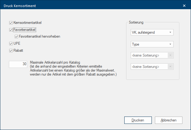 - Vervolgens gaat de dialoog Speciale vensters in software-toepassingen worden dialoog, dialoog venster of dialoog veld genoemd. Dialoog vensters worden in verschillende situaties van de toepassing getoond om bepaalde invoer of bevestigingen van de gebruiker te verkrijgen. Kernassortiment printen open. Daar heeft u nu de mogelijkheid vast te leggen of u van de eerder gemarkeerde catalogi alléén de kernassortiment- of ook de favorietenartikelen wilt printen. Voor de favorietenartikelen kunt u bovendien specificeren of u de artikelomschrijvingen van de favorietenartikelen in kleur geaccentueerd moeten worden, zodat ze sneller gevonden kunnen worden.