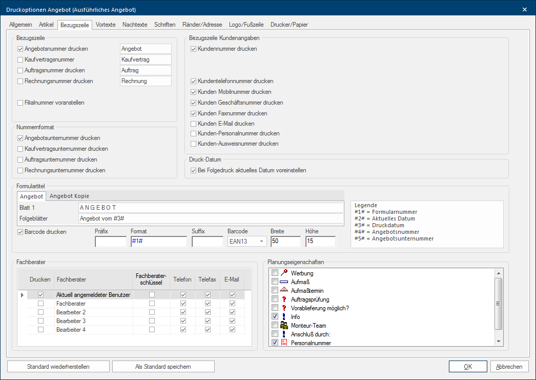 In dit gedeelte kunt u enerzijds via de aankruisvakjes de nummers kiezen, die u in de referentielijn wilt tonen. Anderzijds heeft u met het betreffende invoerveld de mogelijkheid, de benaming van het betreffende nummer voor de referentielijn, aan de eisen van uw bedrijf aan te passen. Indien gewenst kunt u, als u meerdere filialen heeft, ook het filiaalnummer, indien ingevoerd, vóór het betreffende formuliernummer zetten (offerte, opdracht, contract, factuur), dit voor een betere onderscheiding. |