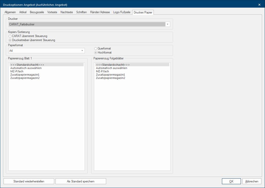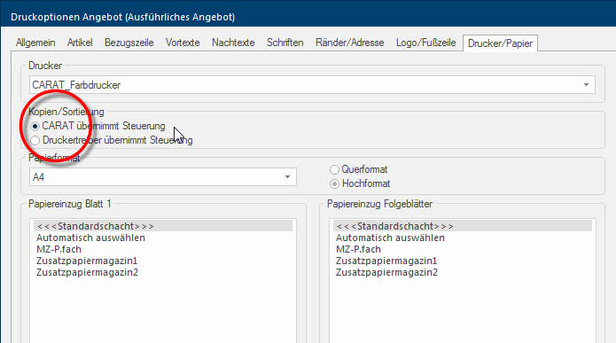 - Het kan echter in sommige gevallen gebeuren, dat de gebruikte printerdriver deze sortering niet zoals verwacht omzet. Daarom heeft u in CARAT, via de optie CARAT neemt de besturing over, de mogelijkheid, in deze gevallen de besturing van de sortering direct door CARAT te laten doorvoeren. Bij een groot aantal exemplaren of grotere logos in uw formulieren kan daarbij eventueel de afdruk een beetje langer duren.