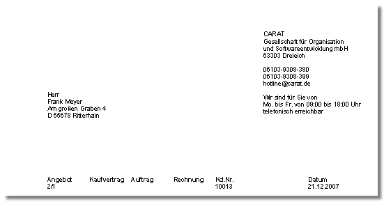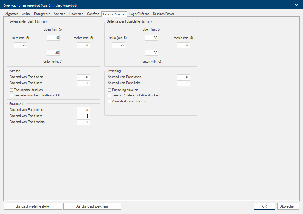 Via het tabblad Sommige dialoog venster zijn zo veelomvattend dat de functies in sub-sectoren worden gedeeld. Deze sub-sectoren worden meestal in het bovenste gedeelte van de dialoog getoond en kunnen worden bereikt door te klikken op de betreffende tekst. Rand/Adres voert u enerzijds de paginamarges in, om het bedrukbare gedeelte van het betreffende formulier te definiëren. Anderzijds kunt u op dit tabblad aangeven in welk gebied het adres van de ontvanger, de firmanaam alsook de referentielijn moeten worden geprint.
