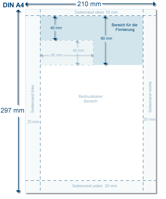 Gebaseerd op de DIN 5008 norm is de hoogte voor het adresgedeelte van uw firma specifieke informatie 40 mm. U dient voor uw firma specifieke informatie een linker paginamarge aan te geven die groter is dan 85 mm, zodat de firma specifieke informatie, inclusief extra informatie, niet overlapt met het adresgedeelte.