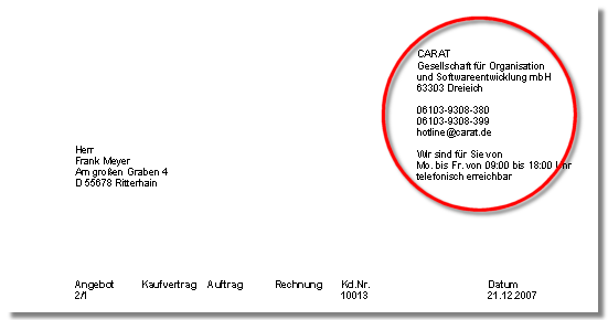 Gebaseerd op de DIN 5008 adviseren wij om de referentielijn zodanig te plaatsen, dat een een afstand van 90 mm van de boven paginamarge aangehouden wordt. In ons voorbeeld is een afstand van 80 mm voor de referentielijn daarvoor voldoende. Indien u wilt dat de referentielijn zich niet over het totale bedrukbare tekstgedeelte uitstrekt, heeft u de mogelijkheid aanvullend een afstand van de linker alsook de rechter bladrand in te stellen. Dit kan nuttig zijn als u boven of onder uw firma informatie nog een grafiek (als logo) wilt tonen, of onder uw firmanaam nog meerdere regels extra informatie gedrukt moet worden. Zie ook: Briefpapier, Logo en Voettekst