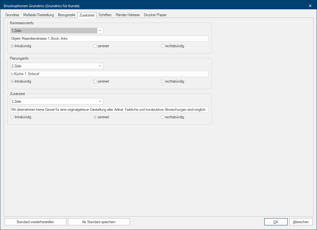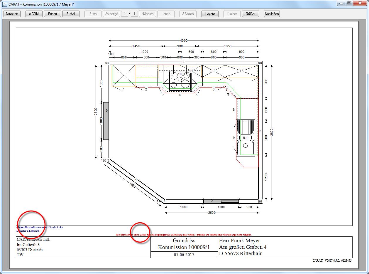 - Zodra u alle instellingen voor de extra tekst heeft gedaan, en de dialoog met een klik Voor zoverre niet anders aangegeven wordt de linker muisknop een keer kort gedrukt. Door het klikken wordt steeds een object gemarkeerd of bij het klikken op en knop, wordt de beschreven actie uitgevoerd (b.v. OK, Beëindigen, Sluiten). op de knop OK gesloten heeft, worden de teksten in het gedeelte tussen de tekening en het tekstveld in het printvoorbeeld getoond.