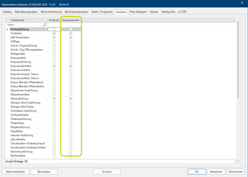 Activeer vooraf de designkeuze op de pagina Print-lay-out in de Systeemopties en markeer de gewenste varianten in de Catalogigegevens van de in gebruik zijnde keukenleveranciers onder varianten in de Ontwerpselectie kolom.