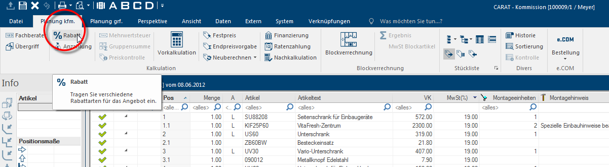 - De Kortingen dialoog wordt geopend door te klikken Voor zoverre niet anders aangegeven wordt de linker muisknop een keer kort gedrukt. Door het klikken wordt steeds een object gemarkeerd of bij het klikken op en knop, wordt de beschreven actie uitgevoerd (b.v. OK, Beëindigen, Sluiten). op het percentagesymbool op het tabblad Sommige dialoog venster zijn zo veelomvattend dat de functies in sub-sectoren worden gedeeld. Deze sub-sectoren worden meestal in het bovenste gedeelte van de dialoog getoond en kunnen worden bereikt door te klikken op de betreffende tekst. Planning com. van de menubalk. Het tabblad Planning com. wordt automatisch getoond in de menubalk zodra u de stuklijst opent. Zie ook: Het tabblad - Planning com.