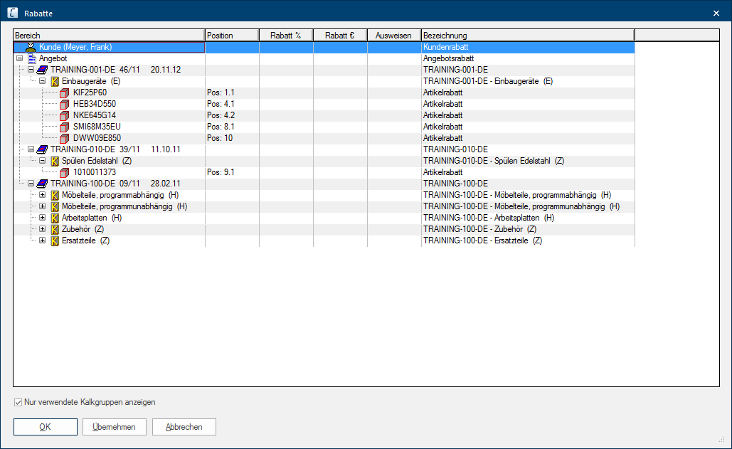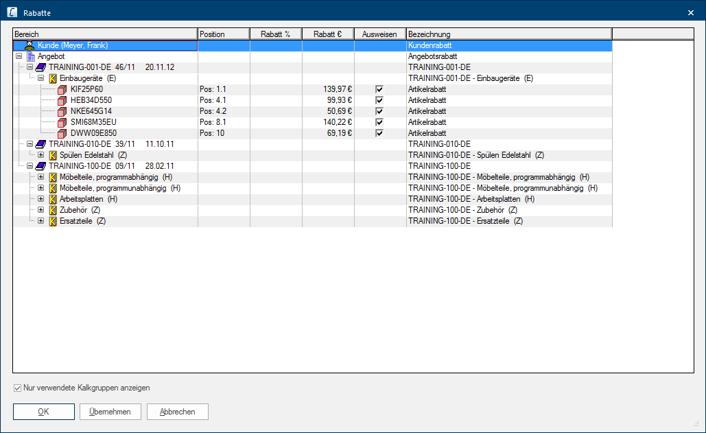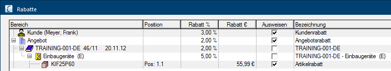 Of en hoe u tegenover uw klant de afgesproken kortingen toont, kunt u via het print lay-out voor de commerciële formulieren instellen. Er kunnen echter alleen die kortingen in een formulier worden getoond, waarvoor u in de kortingen dialoog de optie Tonen heeft geactiveerd. Zie ook: De Print-Lay-out