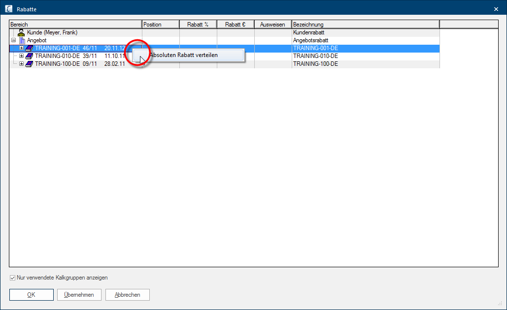 Voor ieder artikel heeft u bovendien de mogelijkheid doelgericht een procentuele artikelkorting of als een korting als valutawaarde in de relevante kolom in te voeren.. |