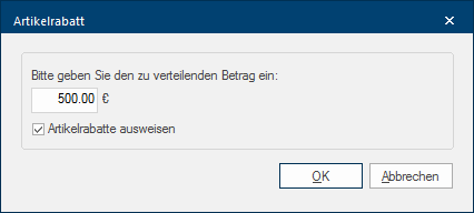 Voor een single artikel kunt u via deze kolom direct een korting als valutawaarde invoeren. Klik daarvoor in het gewenste veld en voer een korting als totaal in. Om een waarde te verwijderen, voert u een waarde van 0 in. Bevestig vervolgens de invoer met de entertoets. |