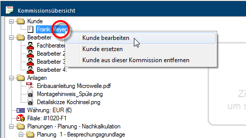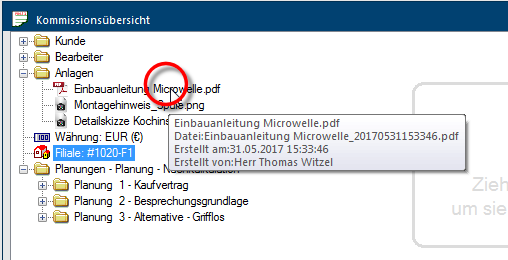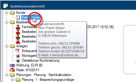 - Om ook in het commissieoverzicht snel een blik op de opgeslagen klantenadressen te hebben, wordt u, zodra de muiswijzer kort op de optie Klant staat, een snelle hulp (Tooltip) getoond.