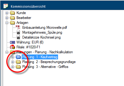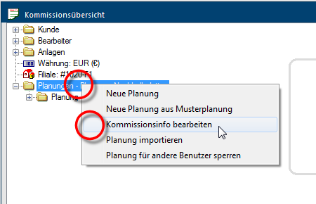 - Om commissies in de dialogen Planningsoverzicht en Commissiebeheer beter uit elkaar te kunnen houden, heeft u de mogelijkheid een specifieke naam voor de commissie, de zogenaamde commissie-info, in te voeren. Klik daarvoor met de rechter muisknop op het foldersymbool met de naam Planningen. Kies de optie Commissie-info wijzigen uit het contextmenu dat zich opent.