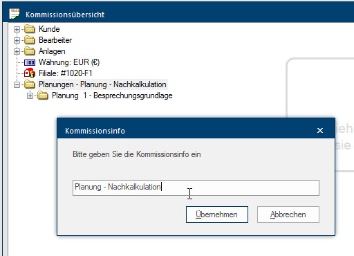 - In de dialoog Commissie-info kunt u nu een alfanumerieke Een alfanumeriek teken is in de strikte zin van het woord of een letter of een cijfer. Het begrip wordt in de telecommunicatie en in de computer techniek gebruikt. naam voor de commissie invoeren. Maximaal 80 tekens kunnen voor de commissie-info worden ingevoerd. Nadat u de nieuwe naam heeft ingevoerd kunt u de dialoog sluiten met een klik op de knop Overnemen. De naam wordt nu direct na het woord Planningen aangevuld.