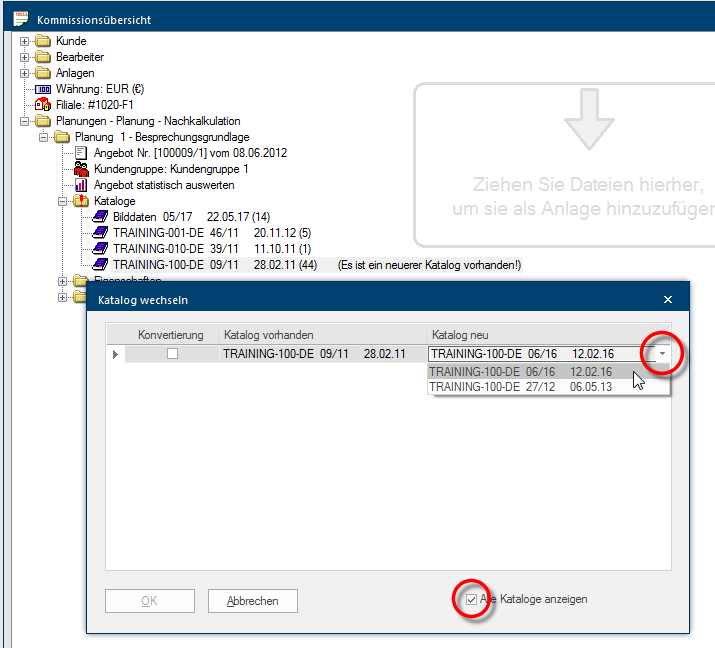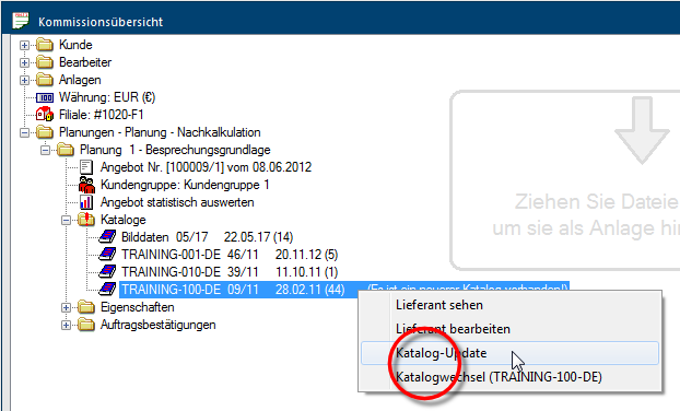 - Als u met de rechter muisknop op de catalogusinvoer klikt, kunt u een contextmenu openen. Afhankelijk ervan of het een om directe opvolger, dus. een nieuwere catalogusversie, of een variant van de catalogus gaat, kunt u de functie Catalogusupdate of Cataloguswissel gebruiken.