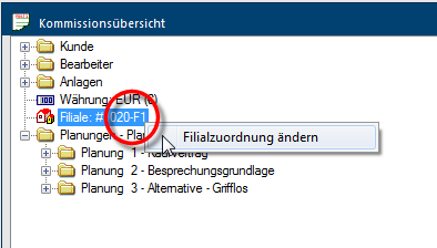 Het kan in de filiaalomgeving ook gebeuren dat een commissie van het ene aan het andere filiaal wordt overgedragen of buiten het filiaalsysteem om wordt ingelezen in een CARAT-installatie. In dit soort gevallen kan het noodzakelijk worden dat de filiaaltoewijzing moet worden veranderd naar het actuele filiaal.
