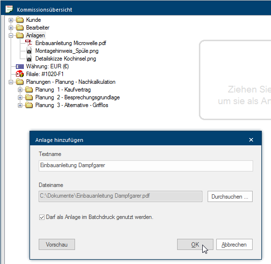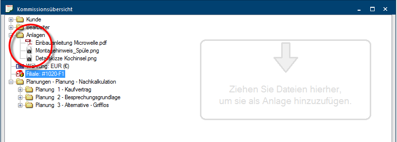 Om een of ook meerdere bestanden op eenvoudige manier als bijlage ter beschikking te stellen, is er aan de rechter kant van het commissieoverzicht een opslaggebied, van waaruit u de benodigde bestanden per slepen & neerzetten (drag drop Drag & drop, „Slepen en Neerzetten" is een methode voor het bedienen van grafische gebruikers omgevingen van computers, door het bewegen van grafische elementen door middel van een aanwijs apparaat zoals bijvoorbeeld een muis. Een element kan daarmee worden gesleept en boven een eventueel doel worden losgelaten.op) direct in de folder Bijlagen kunt neerzetten.