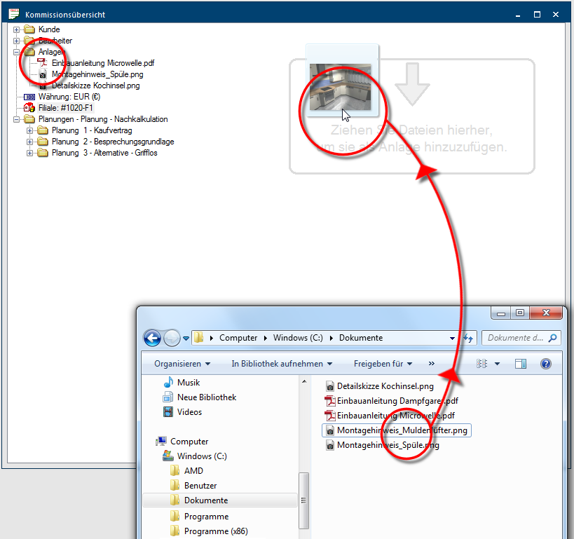 - Open de bestandsverkenner van Windows en plaats deze dusdanig dat u ook nog de opslagplaats in het commissieoverzicht kunt zien. Stel de locatie in waar zich het bestand bevindt dat u als bijlage bij de commissie wilt gebruiken.