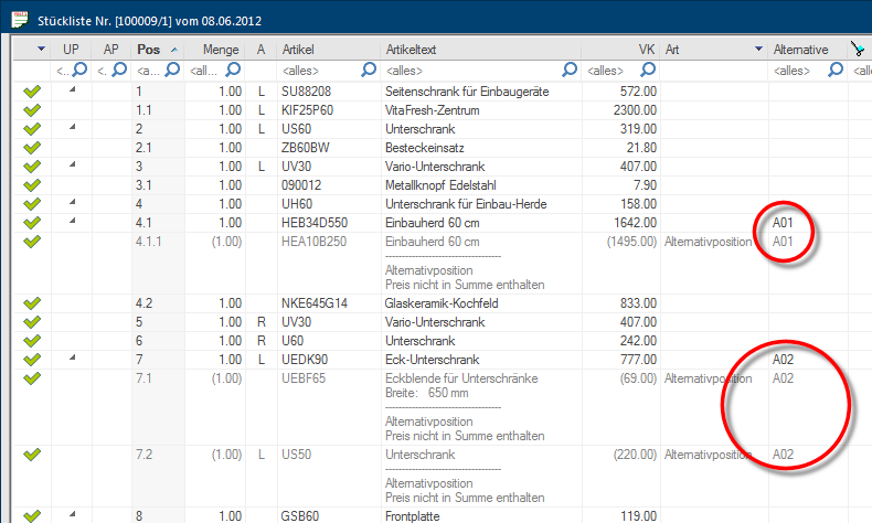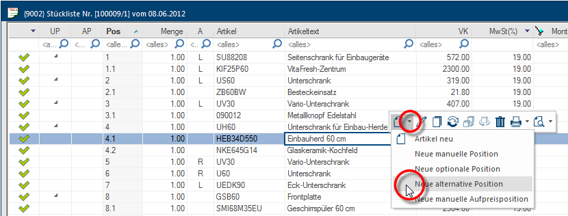 Omdat de toewijzing van een alternatieve positie altijd betrekking moet hebben op minstens één artikel in de stuklijst, moet u eerst het artikel, waarvoor u een alternatieve positie wilt aanmaken, in de stuklijst markeren.
