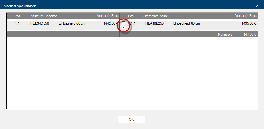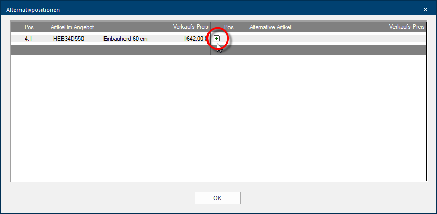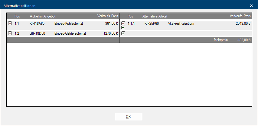 - Nu wordt de dialoog Speciale vensters in software-toepassingen worden dialoog, dialoog venster of dialoog veld genoemd. Dialoog vensters worden in verschillende situaties van de toepassing getoond om bepaalde invoer of bevestigingen van de gebruiker te verkrijgen. Alternatieve posities geopend. Deze dialoog is ingedeeld in twee gedeeltes. In de linker gedeelte staat het/staan de artikel(en) die u eerder in de stuklijst heeft gemarkeerd. In het rechter gedeelte wordt/worden de gekozen alternatieve positie(s) getoond.