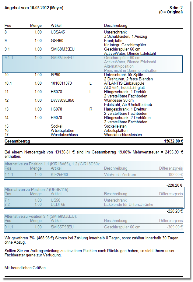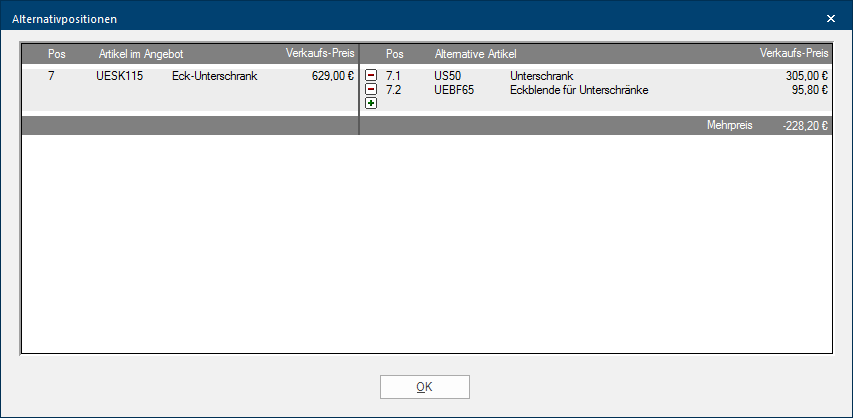 Het kan gebeuren dat u aan één artikel in de offerte meerdere alternatieve posities moet toewijzen, omdat u bijvoorbeeld uw klant als prijsvergelijk een tweede mogelijke oplossing wilt aanbieden, waarbij die tweede oplossing echter uit meerdere artikelen bestaat. Hierbij gaat het dan om een 1:n verhouding. De volgende afbeelding illustreert als voorbeeld de situatie dat als goedkoper alternatief voor de geplande hoek-onderkast, een blinde hoek met een pas stuk en een normale onderkast zal worden aangeboden.