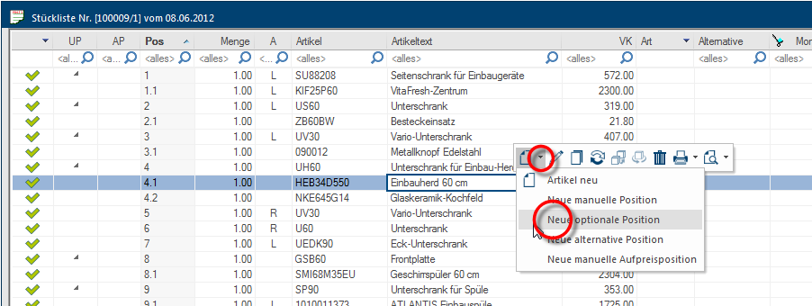 - U kunt een optionele positie of als hoofdpositie aan het einde van de stuklijst toevoegen, of als sub-positie aan een aanwezig artikel inplannen.