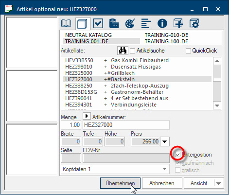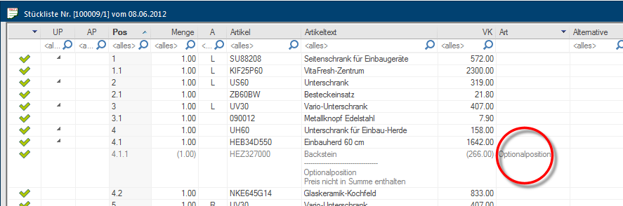 - Vervolgens kunt u de gewenste optionele positie invoeren via de artikel invoerdialoog. Indien u de optionele positie wilt inplannen als sub-positie bij het gemarkeerde artikel in de stuklijst, moet u eerst het aankruisvakje Het aankruisvakje (Engels: Checkbox) is een standaard element van een grafische gebruikersinterface. Een checkbox heeft meestal twee toestanden (aangekruist of niet aangekruist). Dit komt in het algemeen overeen met een ja/nee keuze. Sub-positie markeren voordat u op de knop In een dialoog venster vindt u steeds één of meerdere knoppen die door erop te klikken geactiveerd kunnen worden. Typische acties voor een knop zijn b.v. OK, Annuleren of Toepassen. Knoppen worden altijd met een enkele klik met de linker muisknop bediend. Overnemen klikt. Zie ook: De Artikelinvoerdialoog