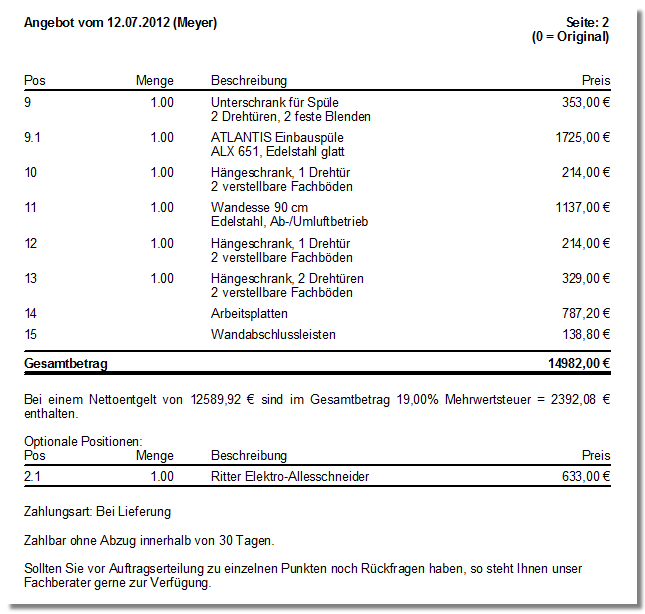 Als u één of meerdere optionele posities heeft gecreëerd wordt in de stuklijst, in de kolom Soort, bij alle optionele artikelen een relevant kenmerk getoond. Voor een beter onderscheid wordt een optionele positie altijd in een grijs lettertype getoond. Tevens wordt de optionele positie aangevuld met de info tekst Optionele positie - Prijs niet inclusief in het totaal. Deze informatie wordt ook in het betreffende formulier geprint. De informatie over het aantal en de prijs van de optionele posities worden tussen haakjes getoond, om erop te wijzen dat deze artikelen geen bestanddeel van de offerte en dus de totaalprijs zijn