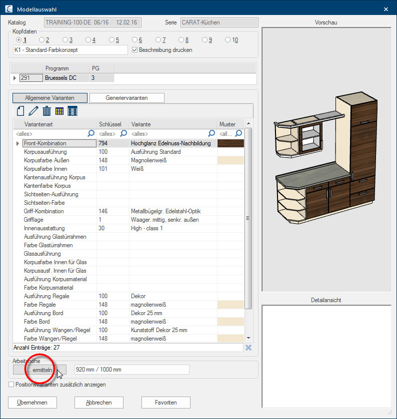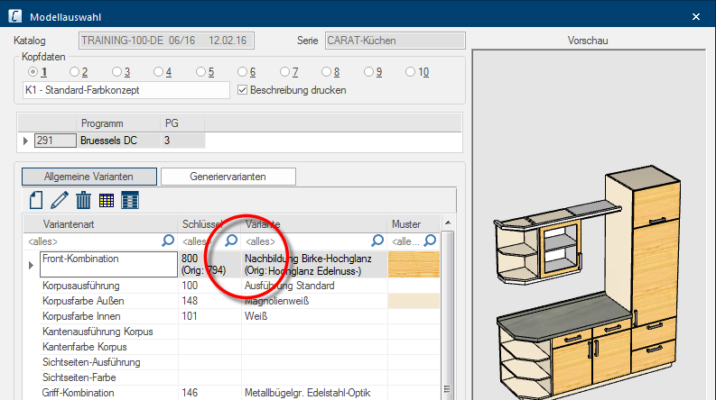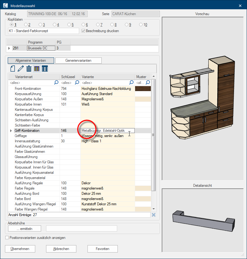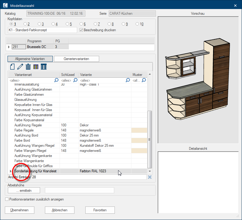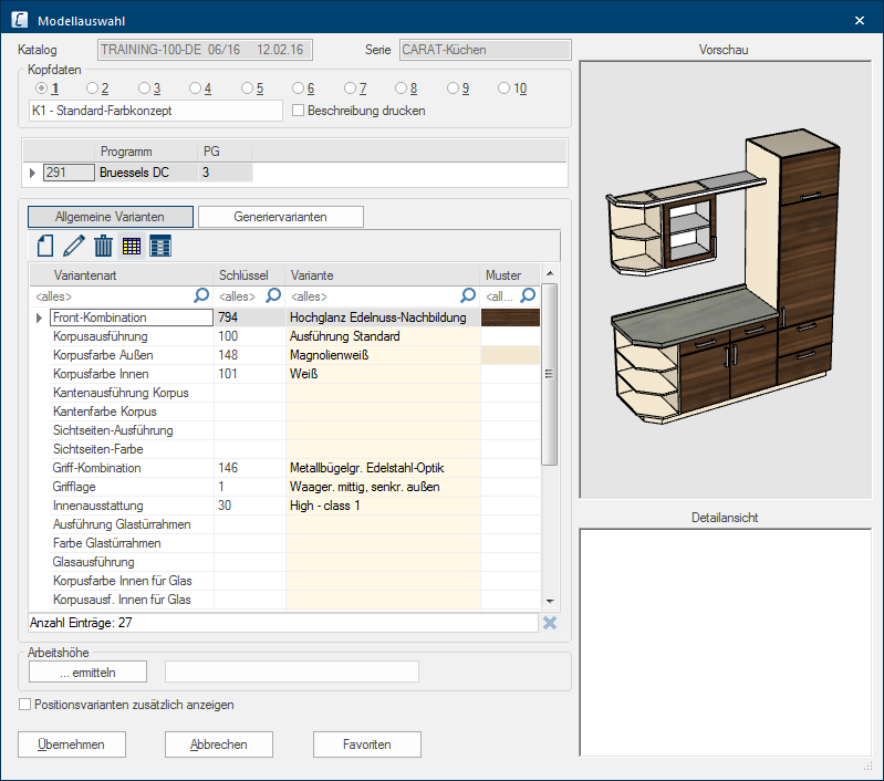 Via de modelkeuze heeft u bovendien de mogelijkheid, voor één catalogus, tot maximaal 10 verschillende modelkoppen, de zogenoemde hoofdgegevens Hoofdgegevens is in CARAT het hyperoniem voor alle gegevens die voor de weergave en de bestelling van een keuken nodig zijn. Dit zijn bijvoorbeeld het gekozen programma of de varianten zoals de uitvoering van de korpus uitvoering of de werkblad kanten., aan te maken. Voor iedere modelkop die u aanmaakt kunt u ook een naam invoeren, die u ook kunt gebruiken voor het printen van een commercieel formulier. Bovendien kunt u reeds ingevulde hoofdgegevens als favoriet opslaan. Favorieten geven u de mogelijkheid, vaak gebruikte varianten op eenvoudige manier op te roepen, zonder iedere keer opnieuw alle varianten handmatig in de modelkeuze te moeten invullen.