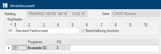 In het bovenste gedeelte van de modelkeuze wordt u eerst de catalogus alsook de gekozen serie getoond. Daaronder vindt u een regel met keuzerondjes, die u kunt gebruiken om meerdere, van elkaar verschillende, modelkoppen aan te maken. Daaronder is een invoerveld waarin u een benaming voor de zojuist getoonde modelkop kunt invoeren. Rechts daarvan is een aankruisvakje Het aankruisvakje (Engels: Checkbox) is een standaard element van een grafische gebruikersinterface. Een checkbox heeft meestal twee toestanden (aangekruist of niet aangekruist). Dit komt in het algemeen overeen met een ja/nee keuze., waarmee u kunt bepalen of deze benaming ook geprint moet worden. Onder de keuze voor de hoofdgegevens wordt het ingestelde programma getoond. Naast de programmasleutel wordt daarvoor ook de programmanaam en de prijsgroep getoond.