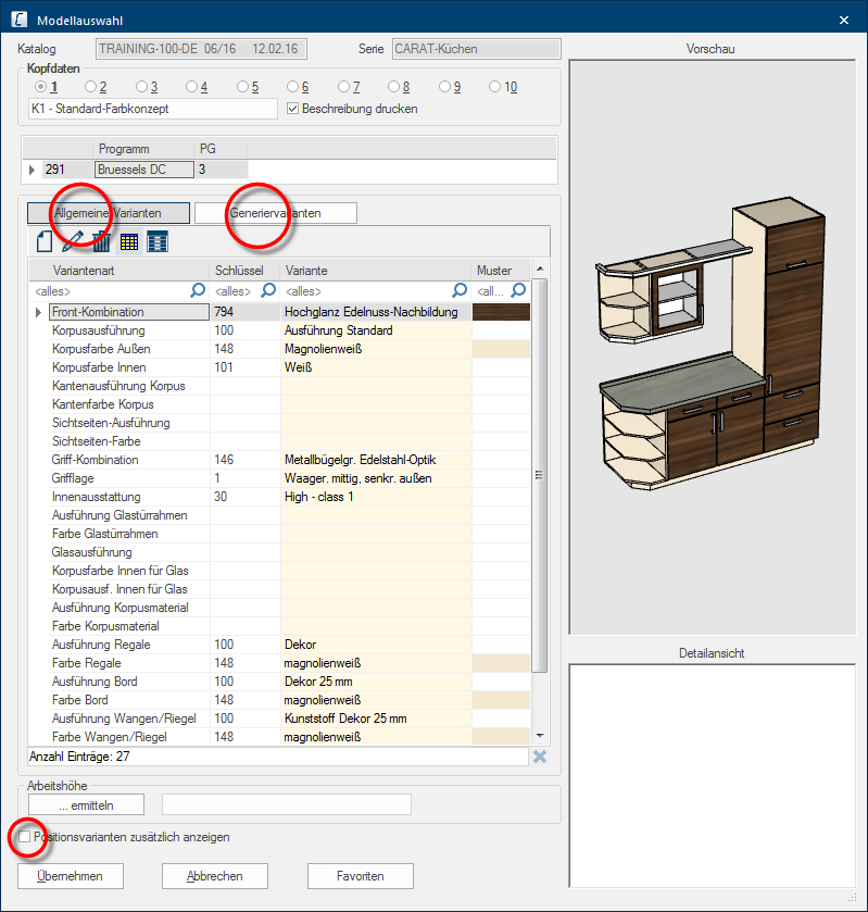 Het kan gebeuren dat naast deze varianten nog positievariaties ter beschikking staan. Meestal kunt u via een positievariatie speciale specificaties voor beperkte artikelgroepen Via een artikelgroep worden in één groep een willekeurig aantal van artikelen samengevat, die een artikel typische gemeenschappelijkheid hebben. Zo worden meestal alle artikelen zoals bijv. meubelen maar ook werkbladen, spoelbakken of elektrische apparaten in dienovereenkomstige artikelgroepen samengevat. selecteren. Deze specificaties kunnen onder andere ook voor de verdere prijsbepaling van het betreffende artikel dienen. Omdat de positievariaties meestal slechts voor enkele planningssituaties nodig zijn, worden de positievariaties in het begin niet getoond, maar kunnen echter zichtbaar gemaakt worden via het aankruisvakje Positie variaties extra tonen, indien gewenst.