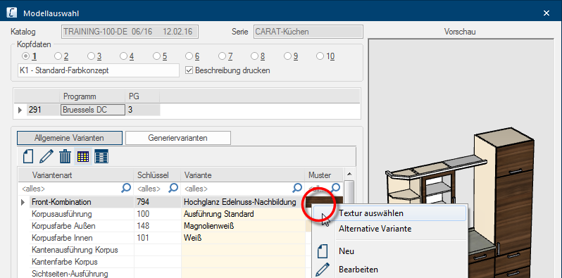 - Klik om een voorgegeven textuur via de neutrale materiaalkeuze te veranderen met de rechter muisknop op de regel van de kleurvariant die u wilt wijzigen. Klik vervolgens in het contextmenu In bijna alle Windows-programma´s wordt door het klikken met de rechter muisknop een keuze menu geopend, waarin de commando's staan die zinvol zijn voor de volgende werkprocessen. dat zich opent op de optie Textuur kiezen.